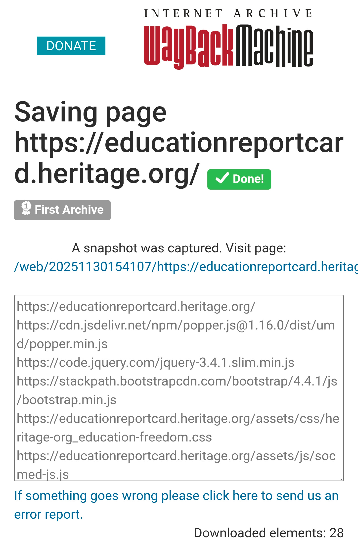 Note: Prior versions of their webpage were not archived with the Wayback Machine. I have now added educationreportcard.heritage.org to their archived webpages.1 If there are others webpages you would like to add to Wayback Machine’s archives: