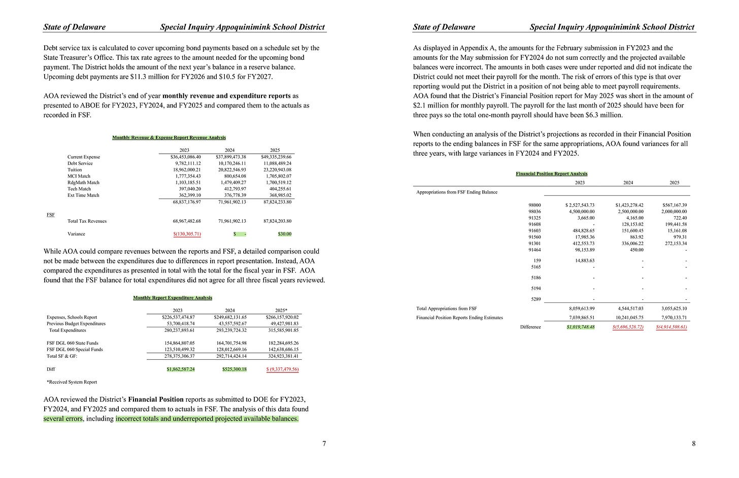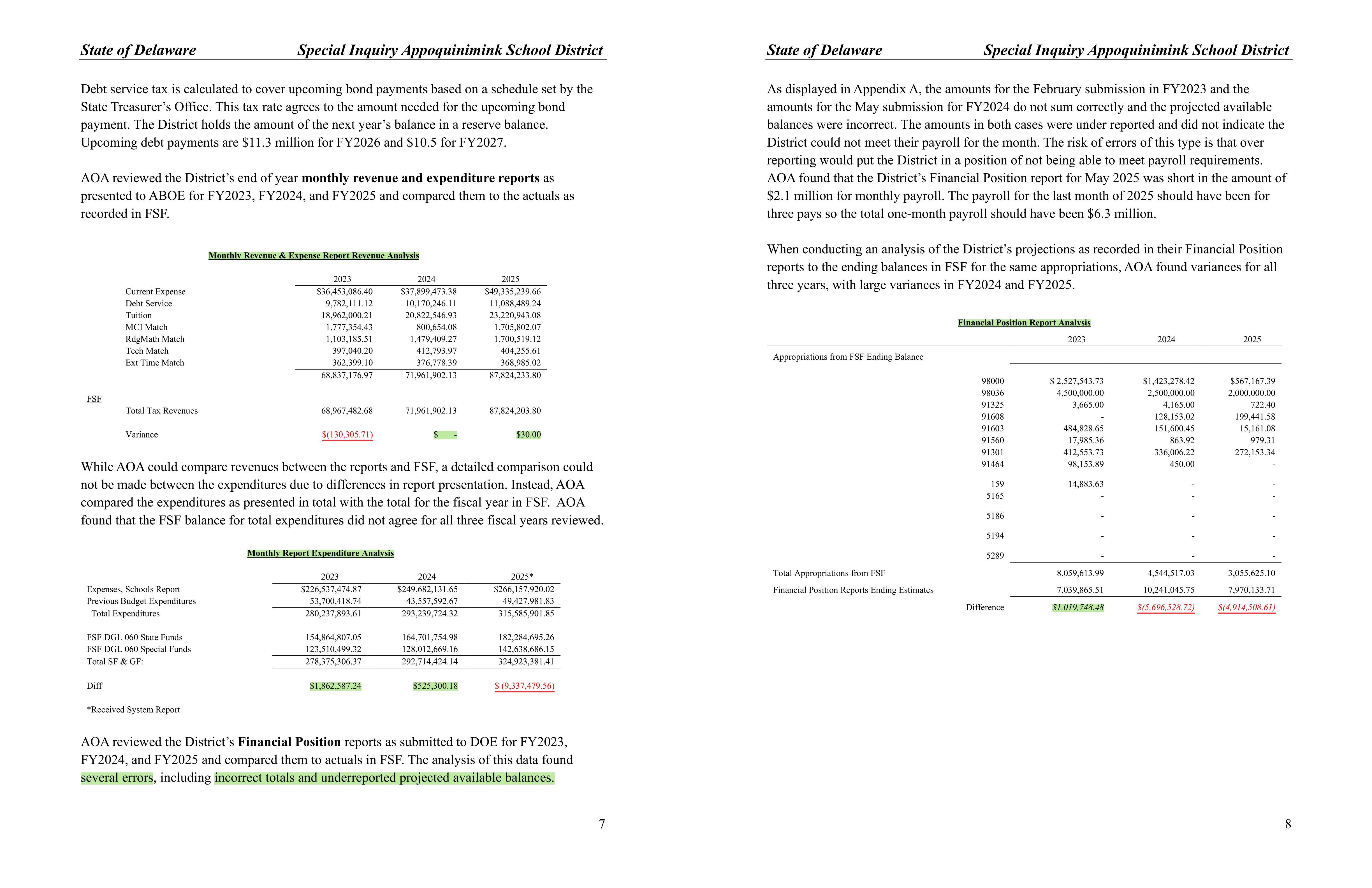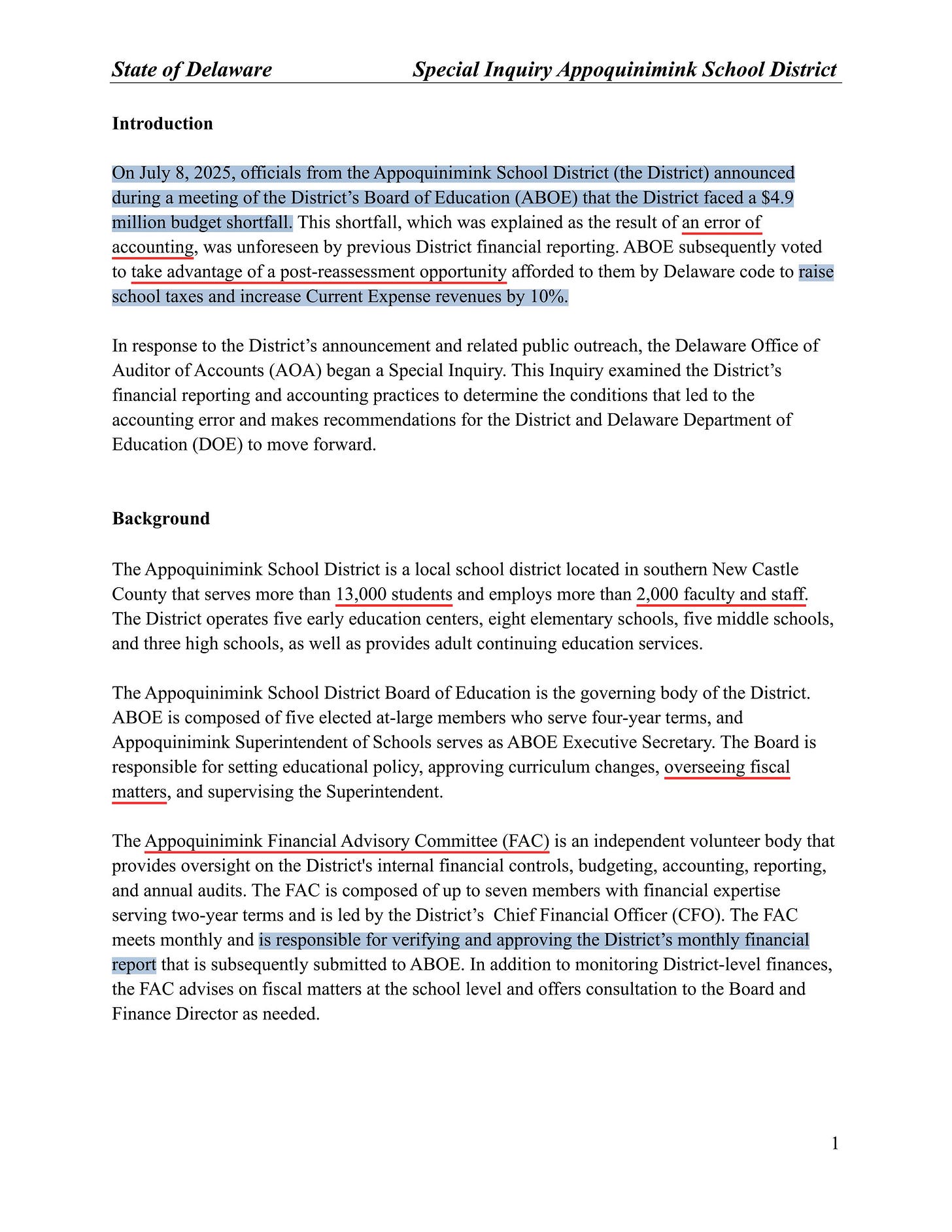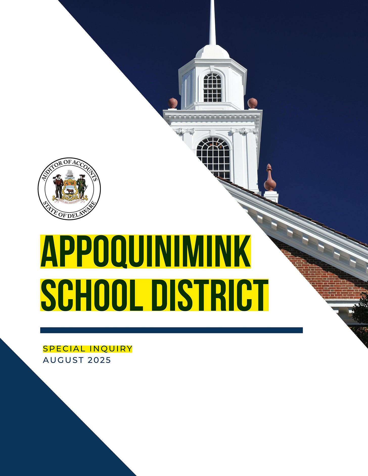 This Special Inquiry report by Delaware State Auditor Lydia E. York investigates a $4.9 million budget shortfall announced by the Appoquinimink School District in July 2025, attributed to “accounting errors”. The district responded by raising current expense taxes by 10%, a unique provision allowed during the year of a reassessment.