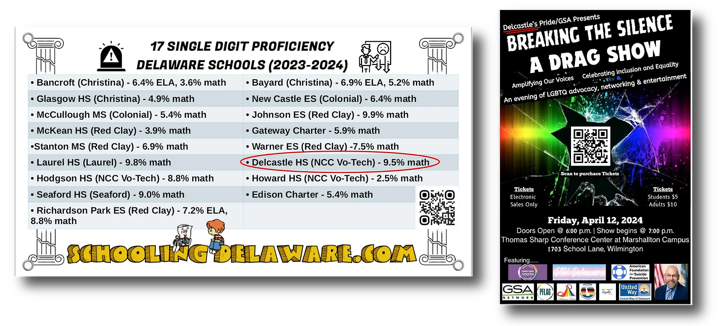 Delaware school districts have been in shambles! From single digit proficiency. high school drag shows, hiding sex changes from parents, ousting superintendents in the wee hours of the morning, to Delaware’s award winning schools grappling with a dire crisis in academic proficiency, Delaware government schools are failing!