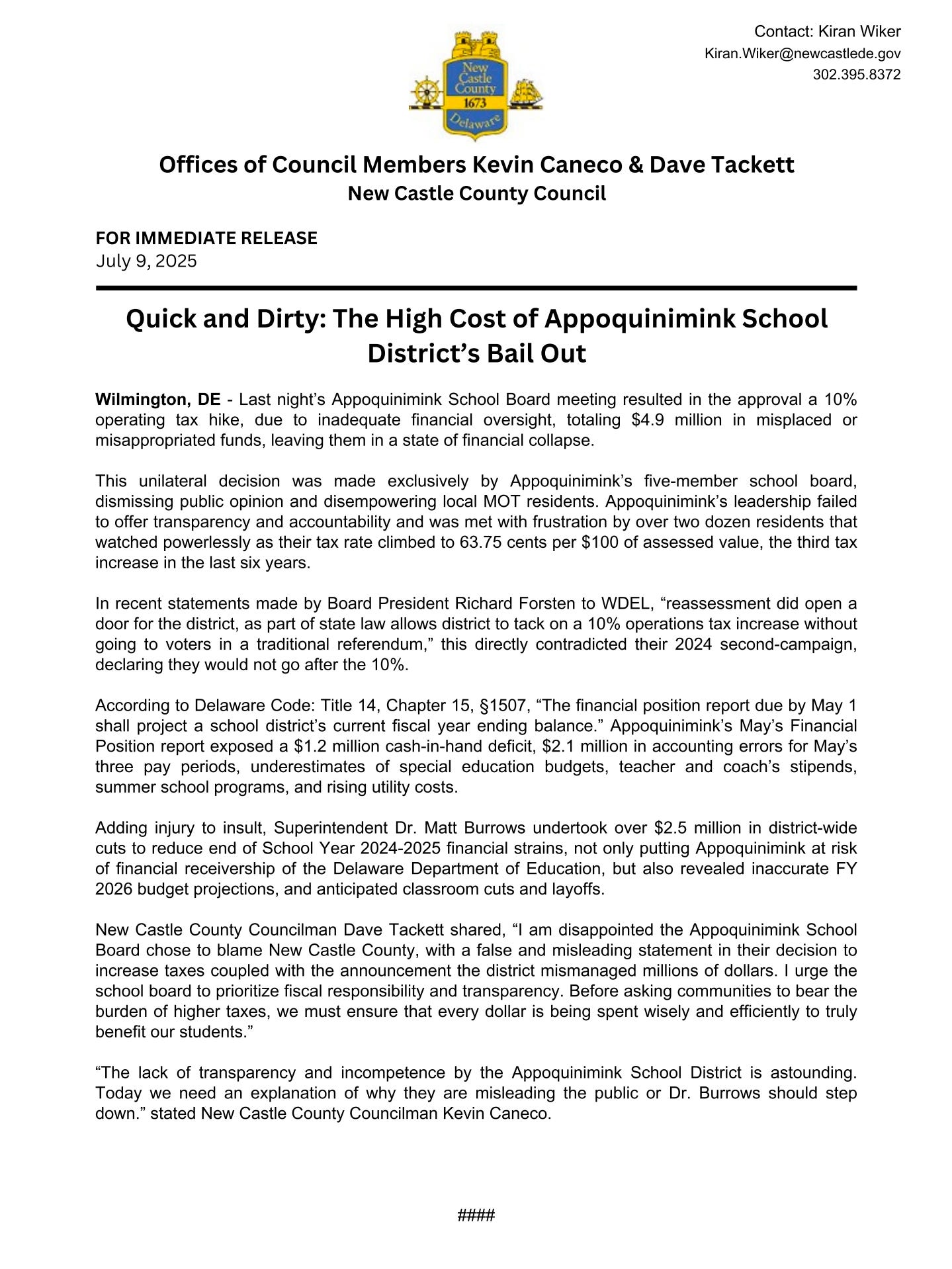 Kevin Caneco (D); New Castle County Council District 12 has been a resonating voice in calling for an audit of the Appo School District and the resignation of Superintendent Dr. Matt Burrows, even putting out a July 9 press release titked “Quick and Dirty: The High Cost of Appoquinimink School District's Bail Out”