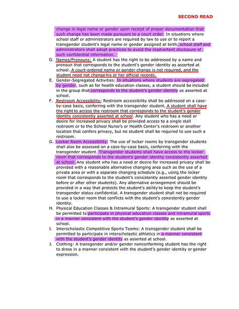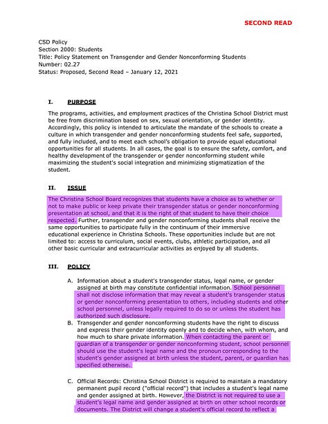 In a December 2024 article, The Lion reported that Red Clay Consolidated School District's Policy 8005 (adopted in December 2021) allows transgender and gender diverse students to express their gender identity at school—including using preferred names/pronouns, facilities like restrooms/locker rooms/sports aligned with their asserted gender, and social transitioning—while permitting school personnel to withhold this information from parents unless the student or parent authorizes disclosure. The policy states that when contacting parents, staff should use the student's legal name and pronouns corresponding to their sex assigned at birth "unless the student, parent, or guardian has specified otherwise," framing this as protecting student privacy and allowing students to decide "when, with whom, and how much to share private information" about their gender identity; the article highlights concerns that this enables schools to "hide" transgender identities from parents without requiring notification or consent.List of School District Transgender – Gender Nonconforming Student Policies