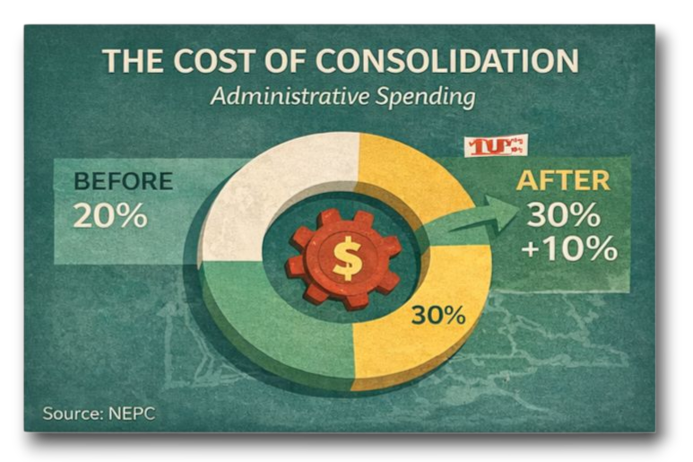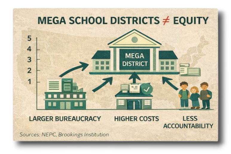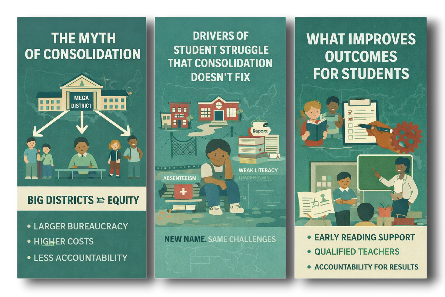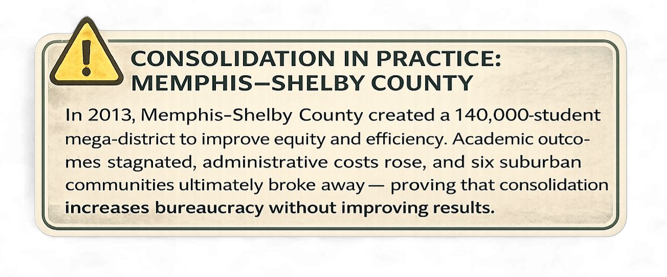 Across independent research groups — left, right, and nonpartisan — the conclusion is the same: consolidation changes governance charts, not classroom outcomes.