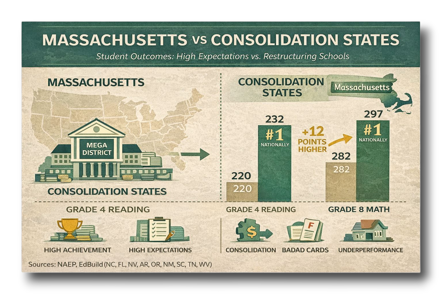 Detailed state NAEP profiles confirm that Massachusetts students score above the national average in both reading and mathematics, underscoring that strong academic outcomes are possible — but they are linked to quality instruction and accountability systems, not simply district boundary structures.